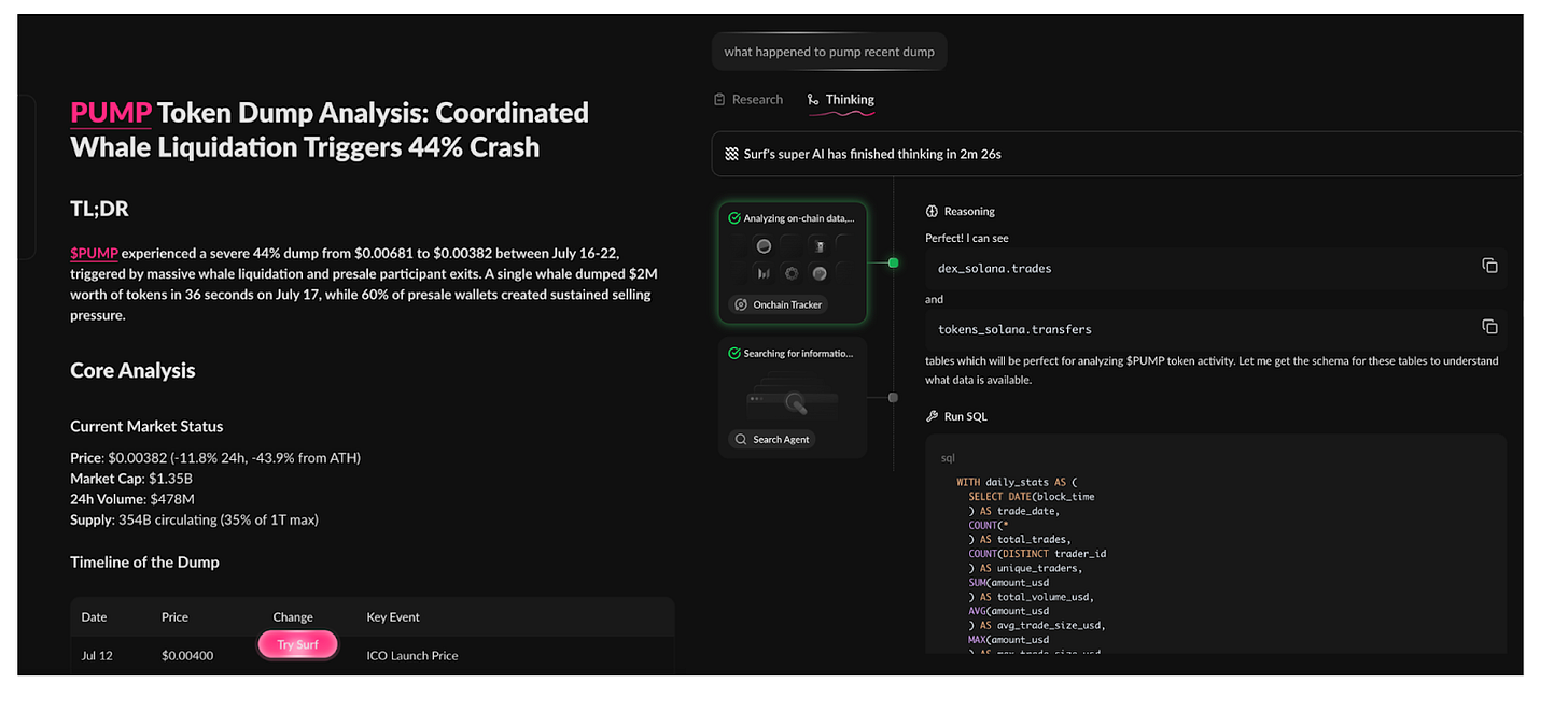 Behind this deceptively simple product interface, Surf tackles many of the thorniest technical challenges of AI – how do we reduce model hallucination, verify data accuracy, and triangulate data sources, all in a high-stakes environment where a single token ticker may map to hundreds of distinct contract addresses, and one mistake could potentially cost millions of dollars in capital. Surf introduces a transparent, multi-agent reasoning system that combines social sentiment, technical analysis, and onchain tracking to “find alpha” in the high-noise, low-signal environment of crypto data, building a product that combines the intuitive workflow of mainstream AI chatbots with the accuracy of professional data tools such as Dune and Dexscreener.