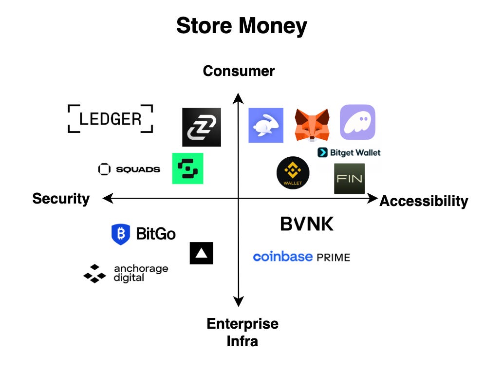 To properly self-custody a crypto asset and interact with the blockchain, a user must have some sort of crypto wallet. Roughly speaking, we can categorize the crypto wallet landscape by two axes: a “security to accessibility” axis, and a “consumer application to enterprise infrastructure” axis. Each category has seen differentiated winners with huge distribution power: Ledger for secure, consumer-facing hardware wallets; Fireblocks and Anchorage for secure enterprise wallet infrastructure; Metamask, Phantom, and Privy being consumer-facing wallets focusing on improving accessibility and UX, while Turnkey and Coinbase Prime capturing more of the accessible, enterprise-grade infrastructure.