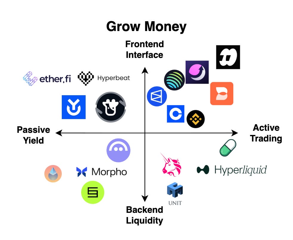 The third relationship that a “crypto neobank” can have with its customer is the ability to “grow money.” This is the area of crypto that has had the highest degree of innovation, accelerating the growth of several 0 to 1 primitives from staking vaults to perps trading to token launchpads and prediction markets. As before, we can classify applications that help us to “grow money” along two different axes – from passive yield to active trading, as well as from frontend interface to backend liquidity.