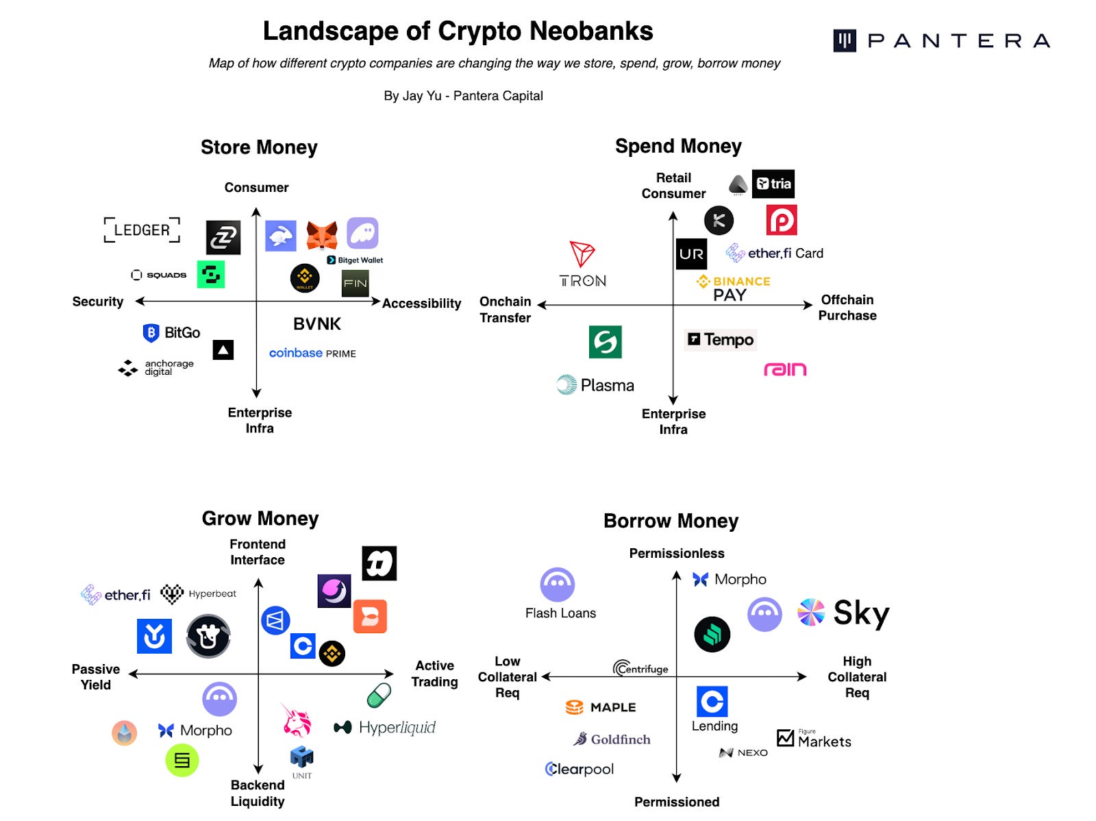 So, with this complicated landscape of crypto neobanks, it is worth walking through this landscape carefully, looking at how different crypto platforms are vying to own the primary financial relationship with users, targeting how users store, spend, grow, and borrow money.