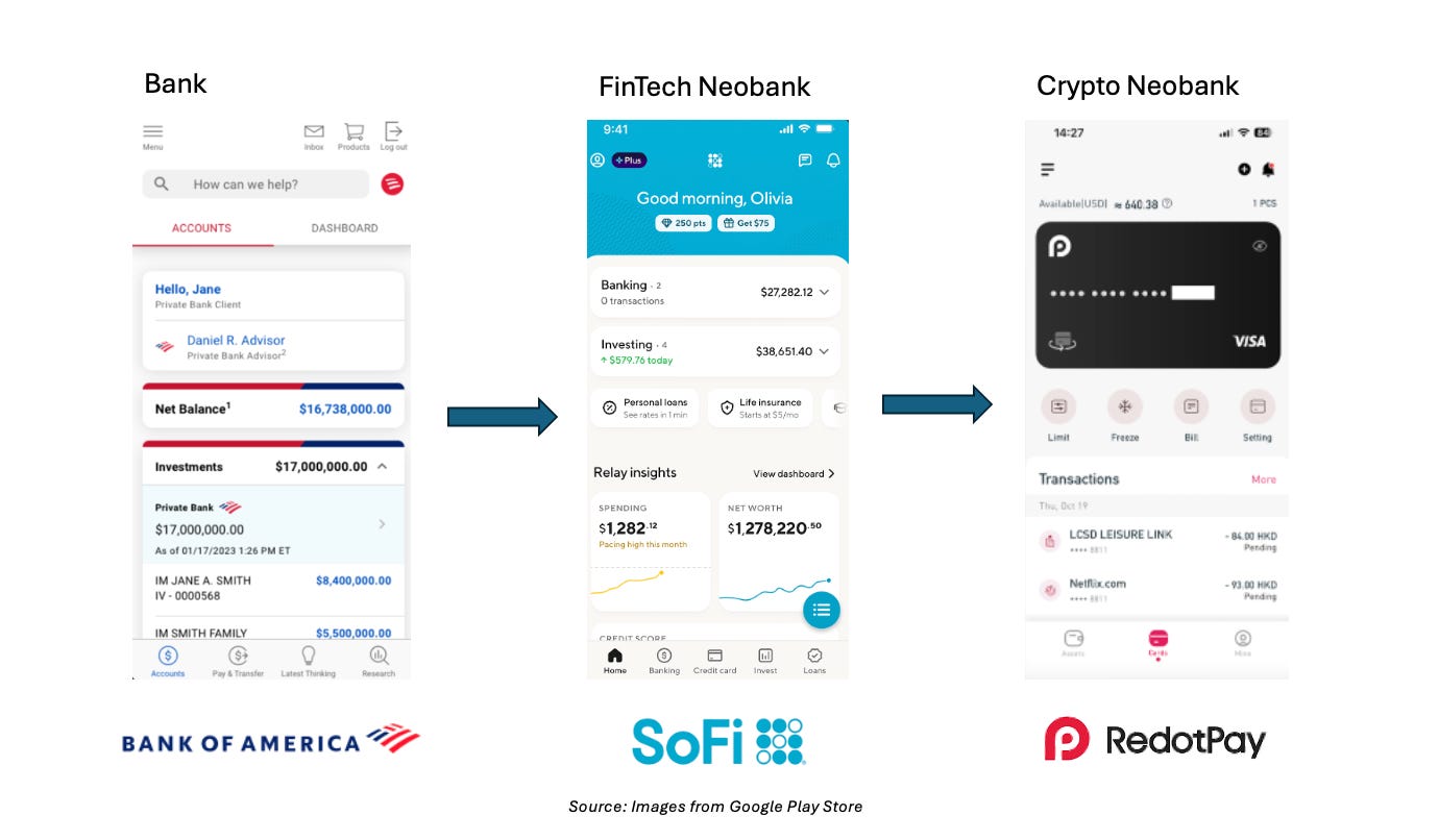 The natural next step is to combine those permissionless backends with the easy-access frontend of a neobank. While the first wave of neobanks moved the frontend of a bank from a physical store to a mobile interface while keeping the banking backend, today crypto neobanks are doing the opposite: keeping the convenient mobile frontend while changing how money moves from traditional banking rails to stablecoins and public blockchains. In other words, if neobanks rebuilt the frontend of banking on mobile rails, crypto now offers the chance to rebuild the backend on permissionless rails.